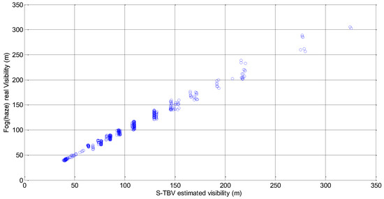 Figure 10 is a scatter plot between real visibility and the visibility estimated by the S-TB algorithm. Figure 10 indicate the large amount of data points with visibility of less than 200 m, since the fog and haze dissipate slowly when the corresponding visibility is no more than 200 m. From the perspective of machine learning, the more the training data are, the better the S-TBV model is. As a result, all the foggy and hazy image data are used for S-TBV model training and the piecewise function coefficients are shown in Table 3.
