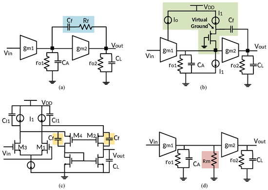 Miller compensation, which has been extensively used in integrated operational amplifiers, deals with stability issues in frequency response by introducing capacitor in series with resistance between the input and output stage. Figure 1a illustrates the architecture of a two-stage amplifier using conventional Miller compensation [25,44]. Its transfer function from the input to the output is