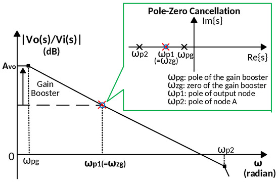 The feedforward compensation technique is introduced to obtain high-frequency performance by implementing pole-zero cancellation [46,47]. Its principle in a folded-cascode amplifier is illustrated in Figure 1c. Assuming poles are widely spread, the positions of zeros and poles are approximately given by