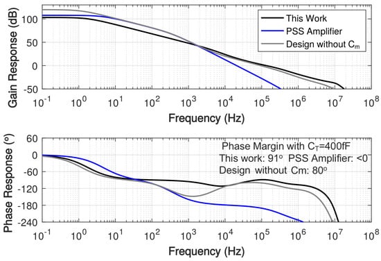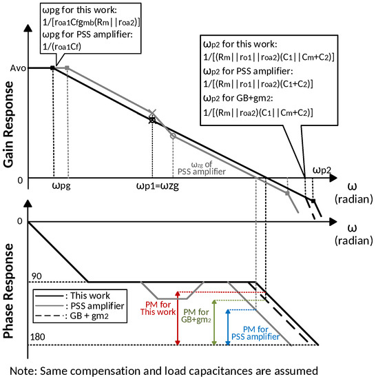 where the and the are the dominant and second pole respectively, the is the unity gain frequency. For the proposed work, the phase margin is primarily determined by the pole from the node A, , as shown in (21), which is not affected by the load capacitance . The capacitance at node A is much smaller than the compensation capacitance and load capacitance. The gain booster and raise the second pole location from to where is approximately but less than and is designed to be much larger than and . Then the ratio between the second pole and the unity gain frequency is increased, which broadens the phase margin. Compared to the design without , the proposed amplifier moves higher from to . The comparison about frequency response bode plots among this work, the PSS amplifier [42] and the design without is shown in Figure 4. With same compensation and load capacitance, this work achieves a larger phase margin and wider unity gain bandwidth.