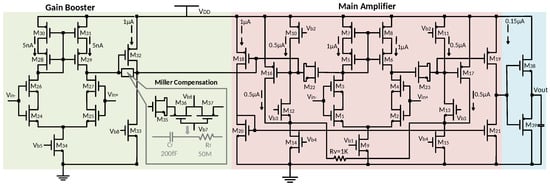 Figure 5 shows the circuit of the proposed operational amplifier. Its transistor size is shown in Table 2. The composite cascode [48] is used as input stage in both the main amplifier and the gain booster in order to obtain sufficient DC voltage gain. Compared to the single transistor with doubled length, the composite pair can provide higher gain. A previous work indicated that the voltage gain exceeding 80 dB per stage can be achieved by the composite cascode configuration with transistors operating in weak or moderate inversion domain [49]. A Class-B output stage is implemented to provide a fast settling time by improving the amplifier slew rate.