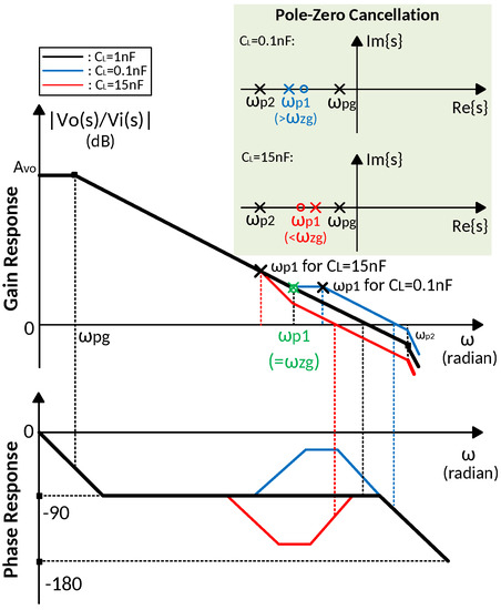 In order to drive a wide range of load capacitance, is designed to cancel with a load capacitance in-between 0.1 nF and 15 nF, as shown in Figure 6. the is designed lower than the output node pole with minimum load capacitance, which is 0.1 nF. With the increase of load capacitance, the gets lower and the precise pole-zero cancellation occurs. Then as the load capacitance further increases, the get smaller than the , and the precise pole-zero cancellation condition is broken, as a result, the phase margin become worse. To prevent a large degradation in the amplifier phase margin, the zero is designed to cancel the with 1-nF load capacitance. Since a precise pole-zero cancellation is difficult to realize, especially when the load capacitance has a large variation, the pole-zero doublet of and may degrade the settling time.