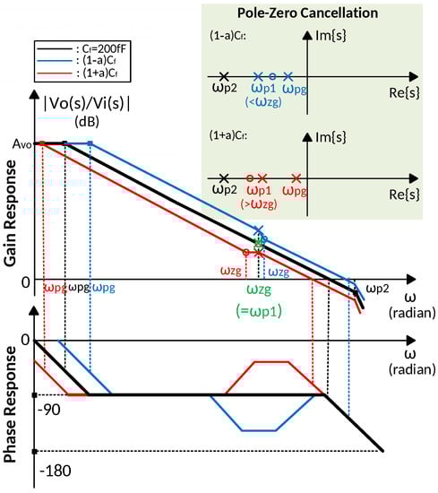 The effect of Miller compensation capacitance variation on the precise pole-zero cancellation is illustrated in Figure 7. The variation on causes a change on both zero and pole introduced by the gain booster, then the unity gain frequency is also changed, while the second pole is fixed. For a +10% change, both and is decreased by 10%, while the ratio between second pole and unity gain frequency is enlarged result in wider phase margin. In contrast, for a −10% variation, both and in increased by 10%, and phase margin is degenerated. The change on the unity gain frequency is approximately obtained as