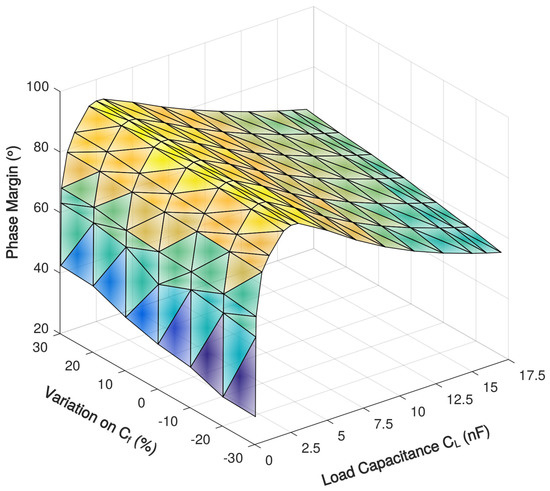 The stability simulation with 0.05–17 nF load capacitance over Miller compensation capacitances variations are shown in Figure 9 and Figure 10 and Table 4 and Table 5. For the prototype amplifier, the maximum phase margin is achieved when load capacitance is 2.5 nF, which is 91. The phase margin larger than 70 with a load capacitance of 0.2–12 nF and it becomes less than 65 when the load capacitance exceeds the 0.1–15-nF range. With the 30% variation on Miller compensation capacitance, the largest change in phase margin is less than 8% and demonstrates a good tolerance on process variation.