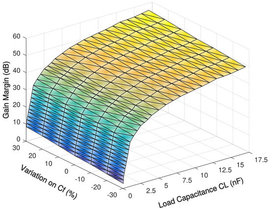 Simulated gain margin of the proposed amplifier with 0.05–17 nF load capacitance over Miller compensation capacitance variations.