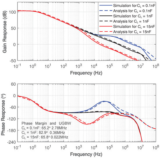 While the two-stage amplifier implementing conventional Miller compensation has a second pole determined by the load capacitance, as shown in Equation (4), the dominant and second pole of this work. which are shown in Equations (19) and (21), are both independent of the load capacitance. As a result, this work can maintain a sufficient phase margin with various load capacitance, and this frequency compensation topology is less sensitive to the load capacitance compared to the conventional Miller compensation.