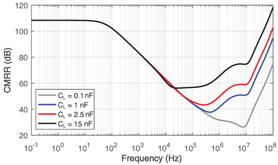 Simulated common-mode rejection ratio of the proposed amplifier with 0.1–15-nF load capacitance.