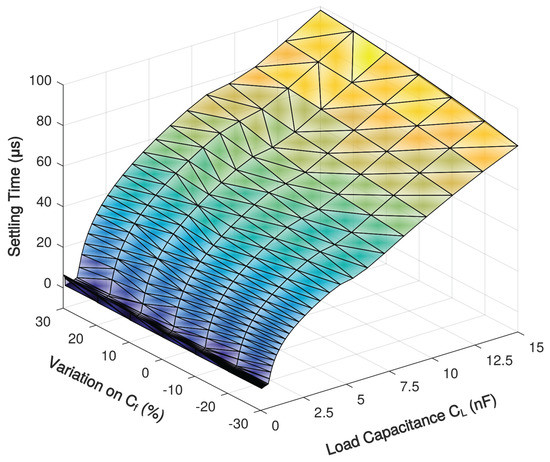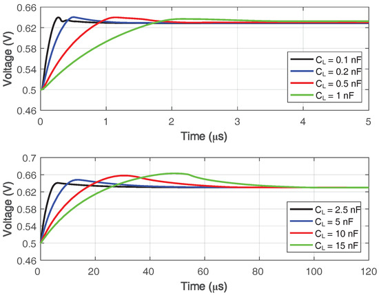 Under a transient simulation setup illustrated in Figure 15, a step response simulation with various load capacitance is shown in Figure 16, and the simulated 1% settling time with variation on Miller compensation capacitor is shown in Figure 17. The 1% settling time is damaged due to exceeding-80 phase margin when driving 1–7-nF load capacitance. With the diminution of , the phase margin decreases, then the 1% settling time is improved.