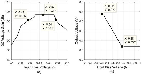 where the is the transconductance of and , and the is the transconductance of and [42]. The is optimized though choosing suitable and to make the second pole much higher than unity gain frequency to obtain sufficient phase margin. is replaced by floating tunable CMOS resistors to reduce the chip area [50]. The bias circuit for this work is illustrated in Figure A1 and Table A1.