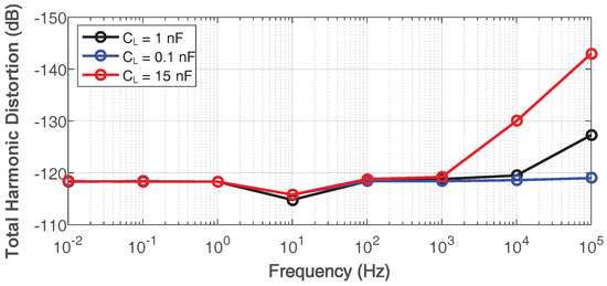 Simulated total harmonic distortion of the proposed amplifier with 0.1-nF, 1-nF and 15-nF load capacitance.