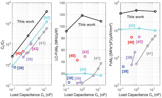 Table 6 compares the simulated performance of the prototype design with the state-of-the-art. Compared to previous works, this work utilizes the smallest compensation capacitance, which is 400 fF, and demonstrates the highest ratio between load capacitance and total compensation capacitance, which is 37,500. In addition, it also presents the best reported performance trade-off on the unity gain bandwidth, load capacitance, and power consumption for a given chip area, as shown in Figure 21.