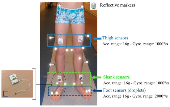 Six synchronized inertial sensors (Physilog4®, Gait Up, Renens, Switzerland) were used in this study. Physilog4® is a standalone device (dimensions: 50 mm × 37 mm × 9.2 mm, weight: 19 g) comprising a triaxial accelerometer, triaxial gyroscope, triaxial magnetometer, and barometer with adjustable ranges, battery, a memory unit, and microcontroller. The magnetometer and barometer were disabled. The sampling frequency was set at 100 Hz. Sensors were fixed on the participant’s thighs, shanks, and feet bilaterally using a hypoallergenic adhesive film (Opsite Flexigrid, Smith & Nephew Medical, Hull, UK), as shown in Figure 1. Sensors on the feet were embedded in a droplet (a small deported 6D sensor unit containing the 3D accelerometer and 3D gyroscope) in order to be appropriate for measuring activities in daily life settings: either barefoot or with shoes. Shank and thigh sensors were always oriented in the same way relating to the thigh and the shank, as shown in Figure 1.