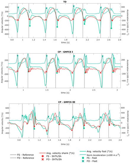 The difficulty to detect events with inertial sensors is directly linked to, first, the pattern of the signal and, second, its smoothness. As illustrated in Figure 2, in abnormal gait patterns, expected features of the signal (such as specific thresholds, time windows, or peaks) can be missing, and non-expected features (such as extra-peaks) can appear which decrease the algorithm performance for event detection. In CP, these abnormal patterns are found especially at the distal parts of the limbs (at feet level) since movements of the distal limbs are more affected by the pathology than the proximal segments [46]. This explains why ShTh seems preferable for children with a high level of disability for gait events detection.