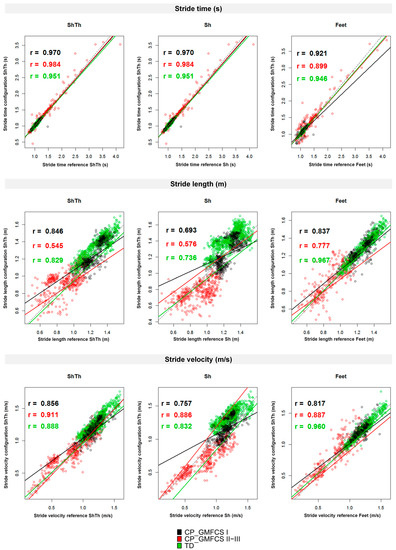 Correlations between the wearable configurations (ShTh, Sh, and Feet) and the optoelectronic system for the three spatiotemporal parameters (stride time, stride length, and stride velocity). Spearman’s correlation coefficients are reported. Dashed lines represent y = x. Green: TD; Black: CP-GMFCS I level; and Red: CP-GMFCS II-III levels.