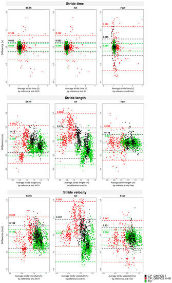 Bland–Altman plots of the three wearable configurations (ShTh, Sh, and Feet) against the optoelectronic system for the three spatiotemporal parameters (stride time, stride length, and stride velocity). Mean error and level of agreement (±1.96 standard deviation) are represented by horizontal lines. Green: TD; Black: CP-GMFCS I level; and Red: CP-GMFCS II-III levels.
