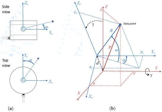 Reference frames and data point coordinates: (a) Velodyne VLP-16 sensor; and (b) RMBL based on a VLP-16. The VLP-16 local frame is represented in blue; the RMBL local frame is represented in red.