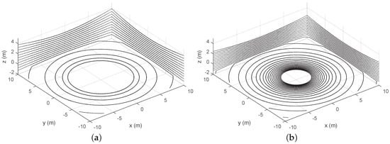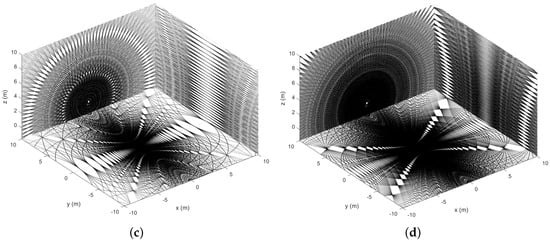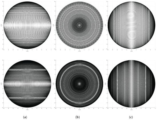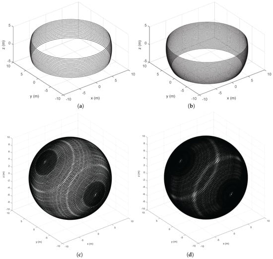 A visualization of sphere points given by the 3D scanners is offered in Figure 2. These points are shown in local sensor coordinates for a sphere of radius m. Figure 2a,b illustrates the inhomogeneous beam pattern of the Velodyne sensors as well as their differences in vertical resolution and FOV. Moreover, Figure 2c,d shows points from RMBLs with different tilt speeds (i.e., different vertical resolutions). Points are distributed over the complete sphere but patterns due to the combination of the VLP-16 beams and the additional rotation are visible, especially in the lower resolution case. These patterns can also be appreciated on the lateral views of the spheres shown in Figure 3. Furthermore, some pattern distortion is appreciable in the central vertical strip in Figure 3a,b, which corresponds to a range of around the extremes of the tilting motion. This can be explained because the eight VLP-16 transducers with positive elevation values when are overlapped with the eight transducers with negative when , and vice versa.