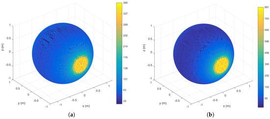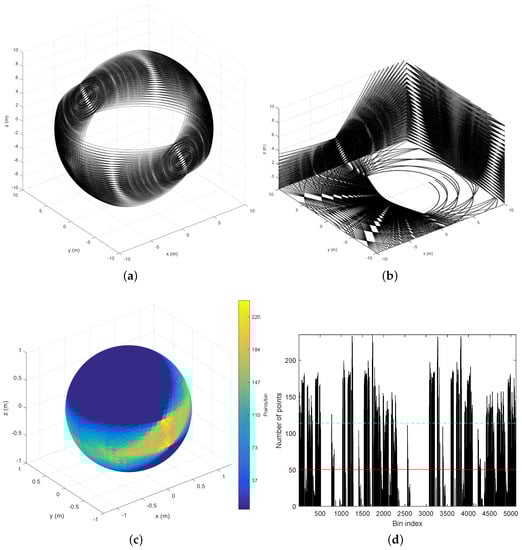 Sampling density for different scanning angles [,] can be represented as a 2D histogram on the sphere. With this aim, the sphere surface is partitioned with a triangular mesh obtained by recursive icosahedron sphere tessellation []. In this work, the sphere surface has been partitioned into 5120 bins.