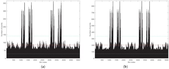 Equation (8) is a modification with respect to [] that accounts for the reciprocity of great circle distances between pairs of points, so the number of required computations is halved. Then, in order to apply this concept to 3D sensor homogeneity assessment, this equation is applied to the set of simulated scan points for discretized angle increments in the interval . For an RMBL based on a VLP-16, a value of is appropriate so that all bins contain a representative number of samples.