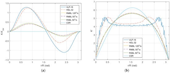 The deviation of with respect to the CSR reference value in Equation (7) is represented in Figure 7a for different great-circle distances r normalized by the sphere radius R. In particular, Equation (8) has been used to compute for the VLP-16, the HDL-32, two different tilting speeds of a VLP-16 based RMBL, and a generic RSBL with the same horizontal resolution as the VLP-16 and a tilt speed of /s. It can be appreciated that the spherical point pattern homogeneity for the RMBL is independent of the tilting speed, as the curves for /s and /s are overlapped.