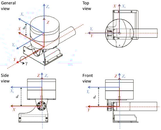 The local frame of the RMBL resulting from the addition of a rotating mechanism (i.e., spinning or tilting) to the VLP-16 is illustrated in Figure 1b. When the rotation angle is null, is aligned with Z, and and are parallel to X and Y, respectively. Let us consider that the rotation axis is parallel to one of the VLP-16 axes; in this case, the rotation axis is Y. It should be noted that rotation about the Y and X axes would be similar, as the VLP-16 has a 360° horizontal FOV, whereas rotation about Z would be pointless as this is redundant with the spinning motion of the multi-beam transceivers. Furthermore, in practice, the rotation axis should be at some small distance d below the VLP-16 for the sake of compactness and shadow avoidance.