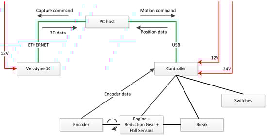 A general overview of the system architecture is shown in Figure 10. The tilting motion is achieved by an EC brushless motor with encoder and brake and an EPOS2 controller, both by Maxon (Sachseln, Switzerland). Two 12 V batteries are used to provide 12 V power to the system (including the VLP-16) and 24 V to the brake. Motion control is performed through a trapezoidal profile in which speed, acceleration and deceleration can be specified by the user to produce a particular scanning resolution. The fastest scan is achieved by setting the tilting speed to 56.25°/s, which corresponds to eight VLP-16 scans. Conversely, high density scans can be obtained by programming slower tilt speeds, which can be as low as 0.05°/s.