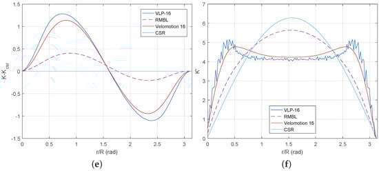 Figure 7b presents the derivative of with respect to the normalized great-circle distance . This graph is interesting because its values for a given distance represent observed frequencies of points separated by that particular distance. The discretization of the axis in 151 sections explains the noise-like aspect of the VLP-16 curve (i.e., the one with the smallest number of samples). The reference curve is symmetrical with respect to the great-circle distance and reaches its maximum at the central value (i.e., for points at about a distance of 90°). This central peak value does not appear in the VLP-16 and HDL-32 curves, where large portions of the sphere are not sampled. Furthermore, some asymmetry is evident for the HDL-32, which is consistent with its asymmetric FOV. The tilting sensors give results that are much closer to the , with a slight advantage of the RMBL with respect to the RSBL.