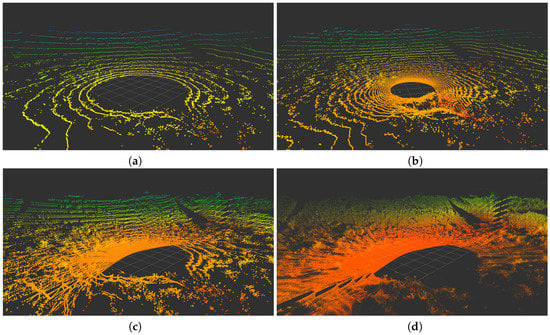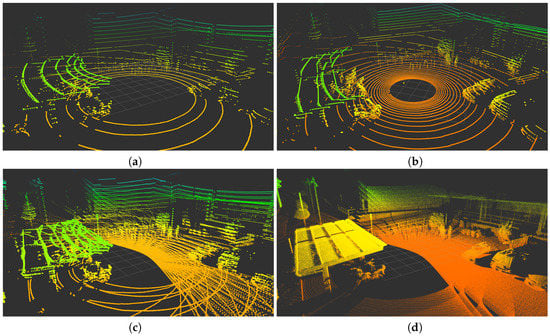 Scans from the urban scene: (a) VLP-16; (b) HDL-32; (c) Fast Velomotion-16; and (d) Slow Velomotion-16.