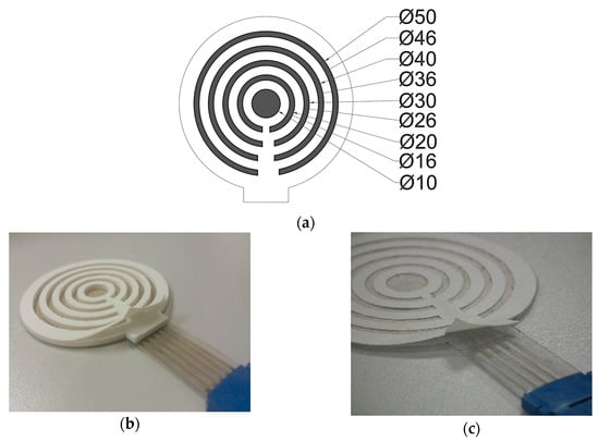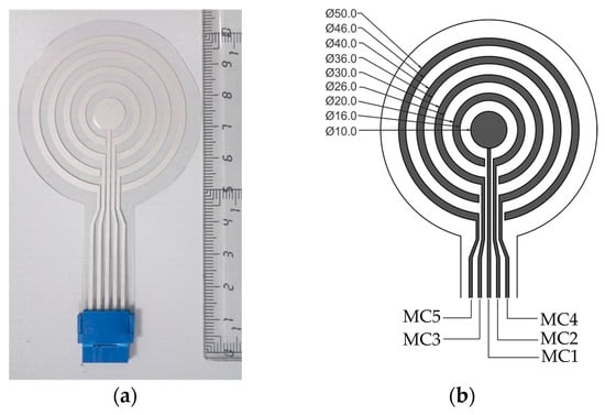 A multi-ring concentric ring electrode (multi-CRE) was designed as shown in Figure 1. The sensing electrode consists of a set of four hook-shaped electrodes and an inner circular electrode. This design allows direct connection of the inner disk and outer rings to the connector to the signal conditioning unit in a single conductive layer, and presents little deviance in spatial sensitivity to that of closed rings [20]. In this work, the diameter of the inner disc was set to 10 mm. The external ring diameter ranged from 20 mm to 50 mm, as shown in Figure 1b. The width of the rings was set to 2 mm. This provides sufficient contact area between the electrode and the skin and means the inter-ring distance can be set to 3 mm, which reduces the risk of undesired shortcuts between poles due to possible scattering of electrolytic gel in wet recordings.