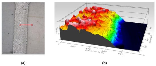 (a) Magnification view of a track of electrode; (b) Right: thickness of view A–B; average thickness is 20 µm measured by Profilm 3D (Filmetrics, San Diego, CA, USA) with 20× lens.