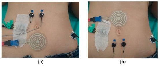 The conductive gel was spread on the multi-CRE without removing the adhesive backing of either material, spreading the gel carefully over all the rings. The adhesive backing was then removed and the electrode placed 2.5 cm above or below the navel (AN or BN positions, respectively), as shown in Figure 4a,b. Two monopolar Ag/Ag-Cl 8 mm recording diameter disk electrodes with 2.5 cm separations were placed 2.5 cm above or below the umbilicus to obtain one bipolar conventional EEnG recording. The duration of the recording sessions was 1 h with the multi-CRE in the BN (best expected location) and 10 min in the AN position.