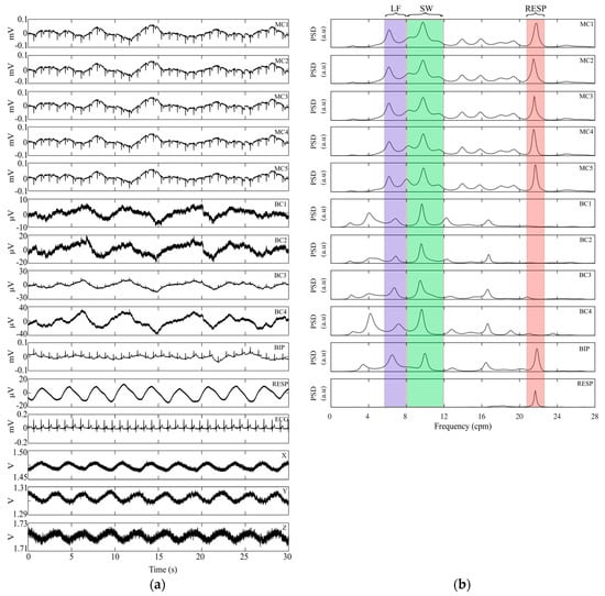 (a) Thirty seconds of signals: monopolar concentric (MC1-5), bipolar concentric (BC1-4) with adhesive material below navel position; bipolar (BIP), respiration (RESP), ECG ML-Lead I and accelerometer signals (X, Y, Z); (b) Power spectral density of signals shown on the left.