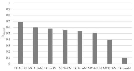 The color scheme in Table 5 shows the best and worst combinations when considering all parameters in a global approach. This is clearest in the IRGlobal values given in Figure 6. It can be seen that in general, the lowest IRs and IRGlobal are from the records from AN with foam for both MC and BC (BCFoAN and MCFoAN). The best IRs seem to concentrate in the combination of BC with adhesive and BN ition(BCAdBN), which obtained the highest IRGlobal values (0.7), followed by MCAdBN and BCFoBN, with values around 0.6.