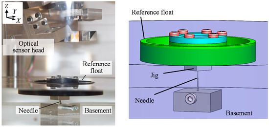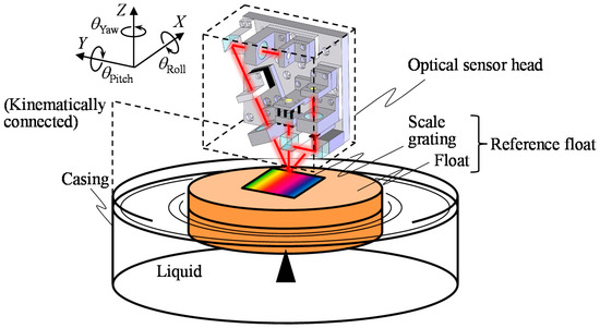 A schematic of the proposed concept of the three-axis inclination sensor is shown in Figure 1. The sensor is composed of an optical sensor head and a reference float that floats on a liquid surface in a casing. The optical sensor head is kinematically connected to the casing. The reference float consists of a scale grating with line pattern structures and a float on which the scale grating is mounted. Although similar concepts using liquids as reference for flatness and a constant level tilt can be found in the literature [22], the proposed three-axis inclination sensor is expected to realize simultaneous measurement of rotational motion about the three-axes with the enhancement of three-axis laser autocollimation [16]. The center point in the bottom surface of float is supported by the tip of a tiny needle, which is rigidly fixed to the bottom of the casing, so that the reference float can be held stationary along the X-, Y- and Z-directions in the sensor system, while allowing relative angular motion of the reference float with respect to the casing about each of the three-axes.