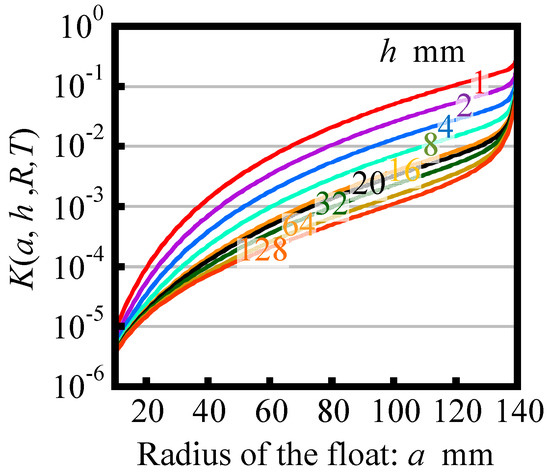 Variation of the factor K as a function of the float radius a in the case of R = 140 mm and T = 8.8 mm.