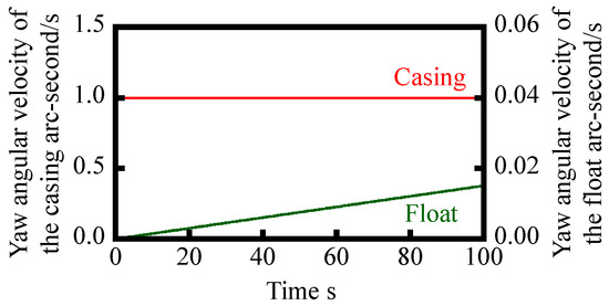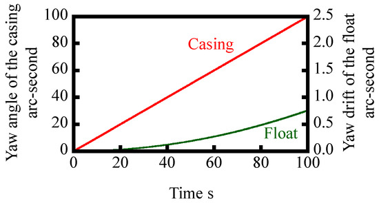 The angular velocity of reference float ωf(t) can be numerically solved by the Runge–Kutta method [26]. In the numerical simulation, a step input with an angular velocity of casing ωc of 1 arc-second/s is assumed, while time step is set to be 10 ms. Other parameters for the simulation are summarized in Table 1. Figure 5 shows the result of numerical simulation, in which the change in the angular velocity of the float with respect to time t is plotted. By integrating the numerically simulated ωc(t) shown in Figure 5, an angular displacement of the float θc can be acquired as shown in Figure 6. As can be seen in the figure, the amount of yaw drift increases with the increase of time. However, on the other hand, the amount of yaw drift after 100 s is expected to be less than 1 arc-second; which is comparable or better than the conventional gyros [15].