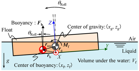 where IX is the moment of inertia of the reference float about the X-axis at the gravitational center, θRoll is the roll angle, c is the viscosity coefficient of the liquid, and M is a torque applied to the reference float. The buoyancy Fb can be expressed as follows: