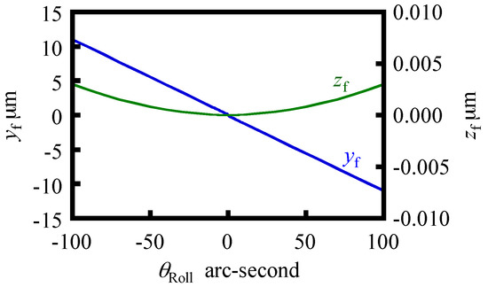In this paper, the point of application of buoyancy (yf, zf) is calculated by using a function in a three-dimensional CAD software. The parameters employed in the simulation are summarized in Table 2. Figure 8 shows variations of yf and zf with respect to θRoll ranging from −100 arc-seconds to 100 arc-seconds in the case of T = 10 mm and a = 30 mm.