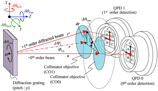 where f is a focal length of the collimator objective (CO0). Meanwhile, the tilt angle of scale grating about the Z-axis does not affect the position of focused laser beam on QPD0; this fact means that the change in yaw angle of the scale grating cannot be detected by the QPD0. However, on the other hand, a QPD for the positive first-order diffracted beam (QPD1) can detect the change in yaw angle of the scale grating. Now the diffraction angle of the first-order diffracted beam ϕ1st with respect to the normal of the scale grating can be expressed as follows [28]: