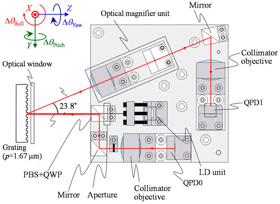 Figure 10 shows an optical design of the optical sensor head for the three-axis inclination sensor. The detailed design parameters of the optical sensor head are summarized in Table 3. As the light source for the optical sensor head, a laser diode with a wavelength of 685 nm was employed. As the two-dimensional photodetectors, quadrant photodiodes with insensitive gaps of 5 µm (S6795, Hamamatsu Photonics, Hamamatsu, Japan) and 10 µm (Hamamatsu Photonics S1651-03) were employed to detect the zeroth and first-order diffracted beams, respectively. It should be noted that the widths of insensitive gaps of the QPDs were small enough to detect the laser beam focused by the collimator objectives. All the optical components were assembled in a home-made optical sensor base designed in a size of within 100 mm × 100 mm. It should be noted that the influence of the earth curvature on the evaluation of pitch and roll angles cannot be neglected [29] in the case of evaluating stage systems having a long travel range in the X- and/or Y-directions, and needs to be corrected when further better measurement accuracy is required.