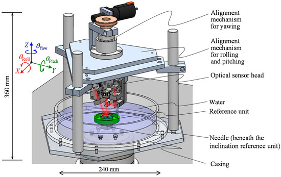 The developed sensor head and the reference float are integrated into the three-axis inclination sensor, a schematic of which is shown in Figure 12. The three-axis inclination sensor is composed of the reference float and a three-axis angle detection unit, which consists of the casing with an inner diameter of 240 mm filled with water, the optical sensor head and its alignment mechanisms. The casing is rigidly connected to the optical sensor head through poles and the alignment mechanisms. The reference float is made to float on the water surface, while it is point-supported at its bottom surface by a needle fixed on the bottom surface of the casing. All the sensor system has been constructed in a diameter of approximately 300 mm and a height of 360 mm.