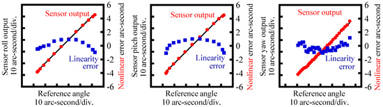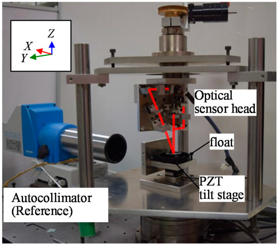 By using the developed prototype three-axis inclination sensor, the basic characteristics of the proposed method have been verified in experiments. First, the static characteristics of the developed optical sensor head were evaluated. Figure 13 shows a photograph of the experimental setup. To avoid the influence of instability of the reference float being floated on the liquid surface, the reference float was mounted on a stage system fixed on the bottom surface of the casing in which the water was drained. To apply tilt angles to the reference float, a two-axis precision PZT tilt stage was employed as the stage system. The tilt angles of the reference float about the Y- and Z-axes (the pitch and yaw angles, respectively) were also measured by using a commercial two-axis laser autocollimator (Elcomat 3000, Möller-Wedel, Germany), which was employed in the setup as a reference. A mirror was mounted on a side face of the PZT tilt stage as a reflector for the commercial laser autocollimator. It should be noted that the commercial autocollimator in the setup shown in Figure 13 could not measure roll angle (tilt angle about the X-axis). However, this could be measured by placing the commercial autocollimator in such a way that the measurement axis of the commercial autocollimator coincided with the Y-axis, while re-mounting the reflector on the other sideface of the PZT tilt stage. In the experiments, tilt angles were applied to the reference float by the PZT tilt stage, while measuring the tilt angles with both the developed optical sensor head and the commercial laser autocollimator. Figure 14a–c show the measured angular displacements about the X-, Y- and Z-axes, respectively. In the figures, the horizontal axes show the tilt angles measured by the commercial laser autocollimator, while the vertical axes show the tilt angles measured by the developed optical sensor head. Linearity errors are also shown in the figures. As can be seen in the figures, good correlations can be found between the outputs from the developed sensor and those from the commercial laser autocollimator. The nonlinear errors of the roll, pitch and yaw measurement were evaluated to be ±0.93 arc-second, ±1.05 arc-seconds and ±1.20 arc-seconds, respectively, over a range of approximately 50 arc-seconds. These values are comparable to the results shown in [16]. It should be noted that the sensitivity of yaw angle measurement was low compared with those of pitch and roll angle measurement; which is mainly due to the different principle of angle detection, as can be seen in Equations (35) and (41). It should also be noted that the calibration and sensitivity verification of the pitch and roll measurement of the developed three-axis inclination sensor can be carried out by the procedure described above, while those for the yaw measurement can be carried out by mounting the three-axis inclination sensor onto a precision spindle equipped with precision rotary encoder.