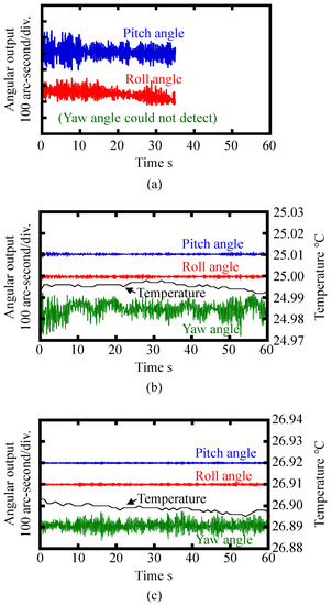 Stability of the three-axis inclination sensor output: (a) Without the fixing needle; (b) With the fixing needle while not using the cover plate on the liquid surface; (c) With the fixing needle and the cover plate on the liquid surface.