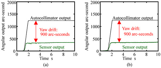 Figure 18a shows the result without the cover plate. In the figure, both the angular output from the commercial autocollimator and the three-axis inclination sensor were plotted. As can be seen in the figure, the developed three-axis inclination sensor successfully detected the given yaw motion. According to the output from the commercial autocollimator, an angular displacement of approximately 1200 arc-seconds was applied to the three-axis inclination sensor. Meanwhile, the output from the inclination sensor was approximately 300 arc-seconds; this result implies that the yaw drift due to the angular motion generated by the linear slide was approximately 900 arc-seconds, which was larger than expected from the simulation described in the previous section of this paper. This result implies that the reference float is sensitive to the step input. A possible root-cause of these results, which were different from the ones estimated in the analytical calculations, is the frictional force between the reference float and the tip of needle. The change in fluid behavior could also induce the shear effect between the reference float and the casing. Meanwhile, on the other hand, variation of the inclination sensor output after giving the step input to the float was quite small. In addition, the sensor output was quite stable: this result indicates the possibility of the application of this sensor for the evaluation of a precision linear slide, which has small angular error motion about each axis. Figure 18b shows the result with the cover plate. As can be seen in the figure, it was verified that the existence of the cover plate did not affect the yaw drift of the reference float.