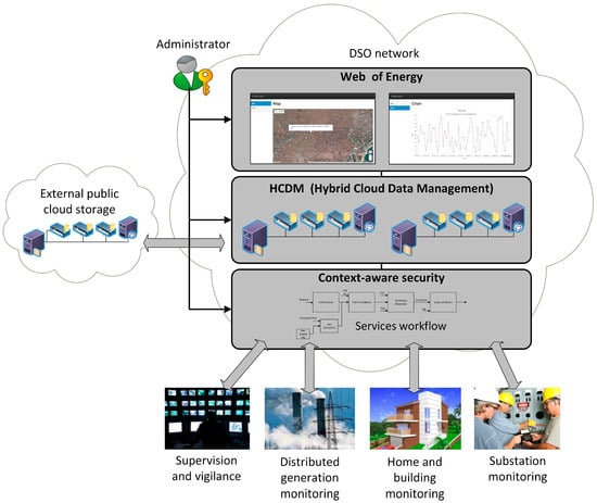 - Hybrid Cloud Data Management: This module provides a data storage and processing system that intrinsically adapts to the Smart Grid’s topology in a scalable and flexible way. Also, it implements an algorithm (also referred to as orchestrator) to decide whether collected data should be stored at the private cloud or could be placed at the public cloud. Such decisions are taken considering the smart functions’ requirements (e.g., reliability, delay, and cybersecurity) associated with the collected data [12].