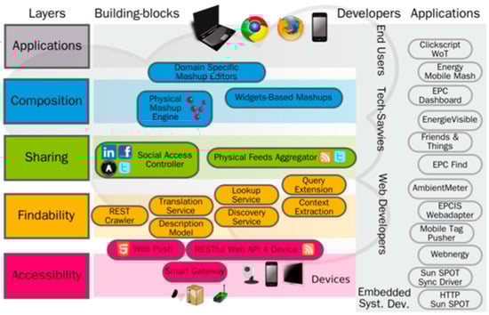 The concept of WoT is developed mainly in the works of Dominique Guinard [9] and Vlad Trifa [21], where the WoT and the methods of enabling devices from IoT to WoT, respectively, are presented. In [9] the WoT is organized into four layers, each with a specific function. However, these layers do not follow an isolation and encapsulation model between non-contiguous layers, as is the case with the OSI (Open Systems interconnection) or TCP/IP (Transmission Control Protocol/Internet Protocol) model but, on the contrary, the applications can be built on top of each one (Figure 2), since all of them are part of the application level of the two network models mentioned above. Next, the different layers of the WoT proposed in [9] are presented.