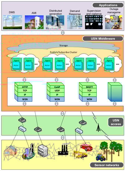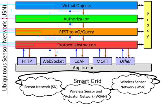 Finally, the application layer conceptualizes all those applications that are likely to interact with the architecture. Within the range of applications supported by the WoT and, therefore, the IoT, those applications of Smart Cities and Smart Grids are grouped. Specifically, the generation of a Ubiquitous Sensor Network [8] is an application that includes the agglomeration of wired and wireless networks of sensors and actuators.