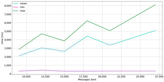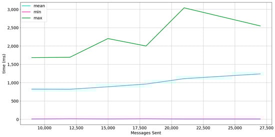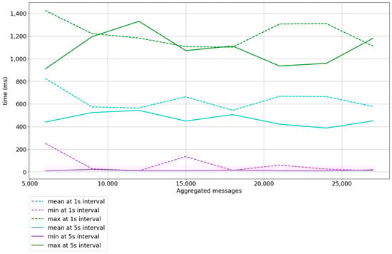The difference of the mean, minimum, and maximum parameters between samples at 1 s interval and 5 s interval are not abrupt, which means that reducing the interval between bursts from 5 s to 1 s does not have a great impact on performance, even with messages that have a payload equal to 1224 bytes. We conclude that our system is capable of delivering 1000 messages aggregating nine messages in their payload within a at an interval of 1 s between 1000 messages, which is equal to 9000 aggregated messages delivered in less than 1.5 s and at a mean rate of 600 ms. The experiments start when 2 messages are aggregated, since the aggregation of 1 message is nonsense.