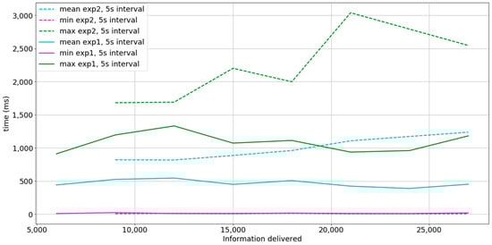 In Figure 11 a comparison between experiments 1 and 2 with the description setting where the time between bursts is 5 s is shown. The mean timedelta obtained in both experiments shows that a better performance can be achieved by aggregating messages (experiment 1). The slope of the mean function in experiment 1 is approximately 0 and the slope of the mean function in experiment 2 is positive. No messages were lost in either experiment 1 nor 2. While results in experiment 1 conform to time needs of non-critical Smart Grid applications, results in experiment 2 conform to some of time needs in critical Smart Grid applications [4,59,60]. We also conclude that message aggregation is preferred when possible, as it reduces the overheads of the entire system.
