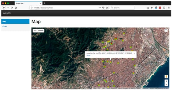 To conclude the experiments, we directed our efforts to developing a web portal to visualize the data available through the HTTP and the WebSocket protocol, which prototypes the WoE. 1000 devices have been simulated, emitting synthetic smart meter data every 5 s. These sensors are distributed throughout the city of Barcelona. Figure 12 shows one of the functionalities of the system, a heat map updated every 5 s in near real-time. However, Figure 12 only shows a few of those sensors because the web browser performance is rapidly decreased as more and more objects need to be painted. A possible solution could be to aggregate smart meter readings and show the aggregation value in the heat map.